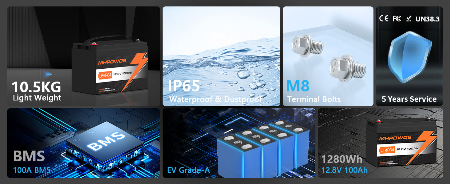 Featured EV Grade LiFePO4 cells, LiTime 12.8V 100Ah lithium battery provides superior performance and reliability. Built-in BMS, it monitors the operating of the battery to ensure its safety and efficiency. Plus, its IPX4 water and dust resistance makes it perfect for outdoor adventures. Power your life with MHPOWOS battery!