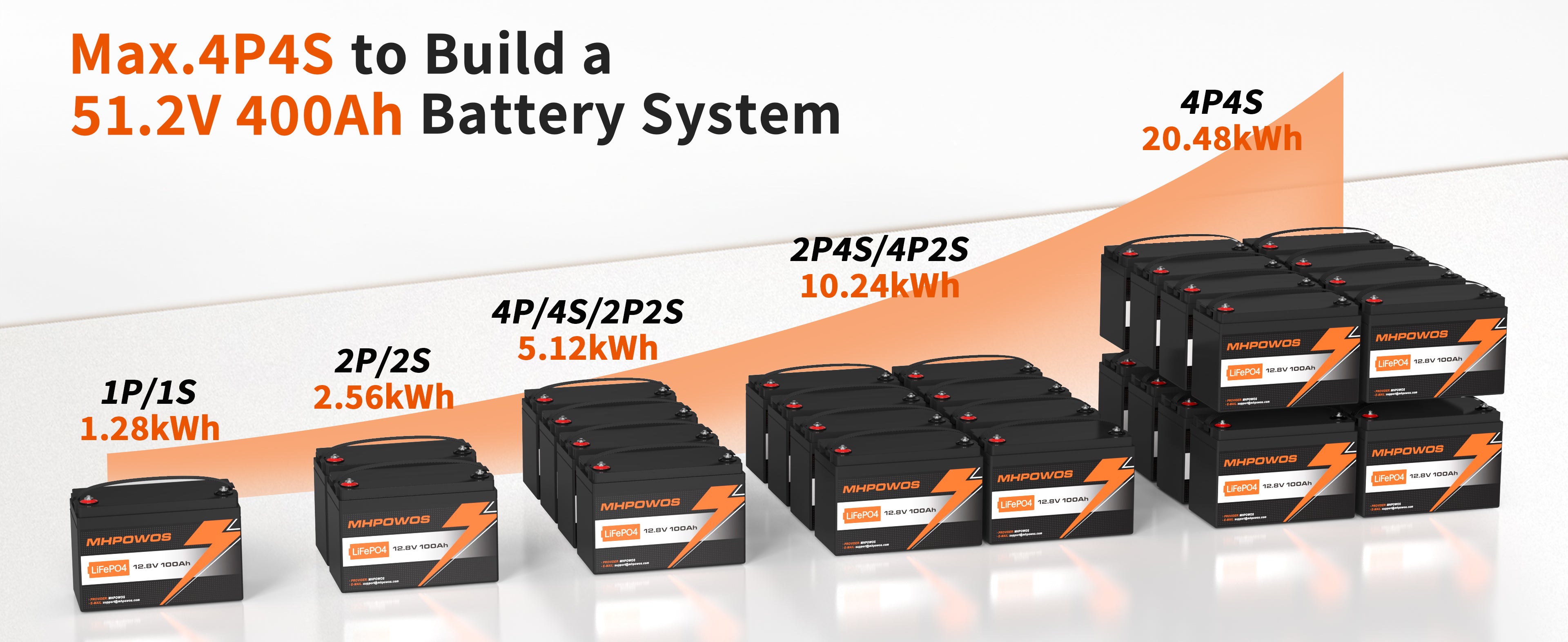 Supports flexible 4P4S configurations, enabling easy capacity expansion from 12.80kWh to 20.48kWh. Max 16 batteries can be connected to build a 51.2V 400Ah high capacity lithium battery pack. Paired with a 40A MPPT controller, it ensures stable operation throughout the process of solar power generation, energy storage, and inverter output.