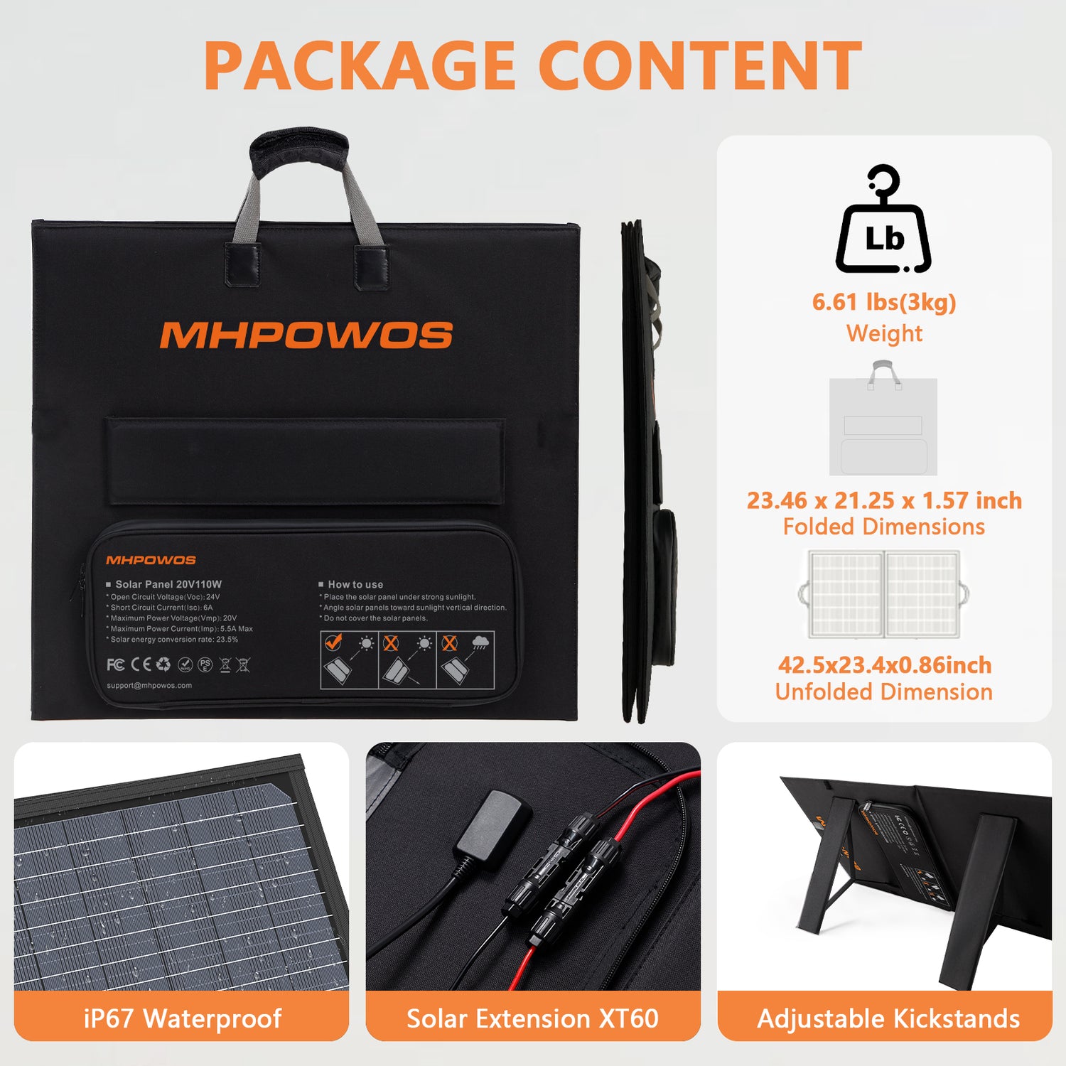 • Package list: 110W Solar Panel*1, 7 in 1 Solar Cable*1, User Manual*1