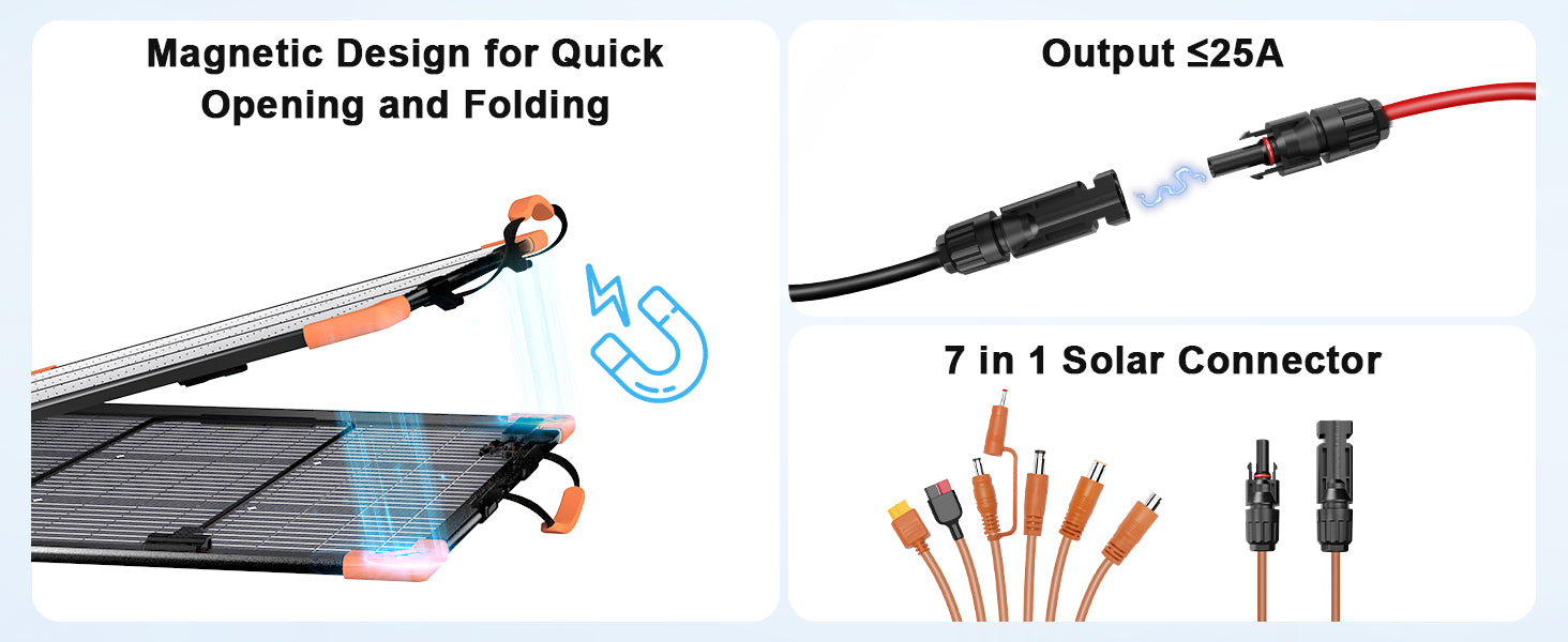 Wide Compatibility. Equipped with solar extension cables compatible with DC7909, DC8020, XT-60, DC5521, DC5525, DC35135 and Anderson connectors. Instant and convenient power to your appliances, both indoors and outdoors with magnificent solar power!