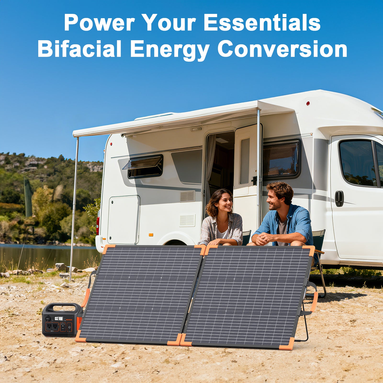 MHPOWOS 100W Bifacial Foldable Solar Panel captures sunlight from both sides, delivering up to 20% higher power generation compared to traditional single-sided panels. With 23.5% high conversion efficiency and a durable ETFE surface, it ensures long-lasting, stable performance. The IP68 waterproof rating provides strong protection against rain, dust, and harsh outdoor conditions. Weighing only 7.7 lbs, it is lightweight, foldable, and easy to carry. Ideal for camping, RV, home PV systems or power stations.
