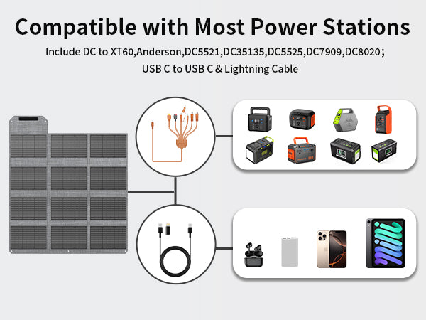With 7 in 1 solar connector (XT60,Anderson,DC5521 DC15135,DC5525,DC7907,DC8020), the 80W solar panel for power stations is compatible with the majority of small portable power stations and solar generators that exist on the market