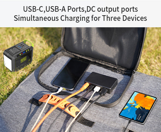 • 4 Output Ports:1 DC output(5A Max), 1 USB-C output, and 2 USB A. It can charge your phone, iPad, laptop, camera, GPS, power bank, and other devices wherever you are.