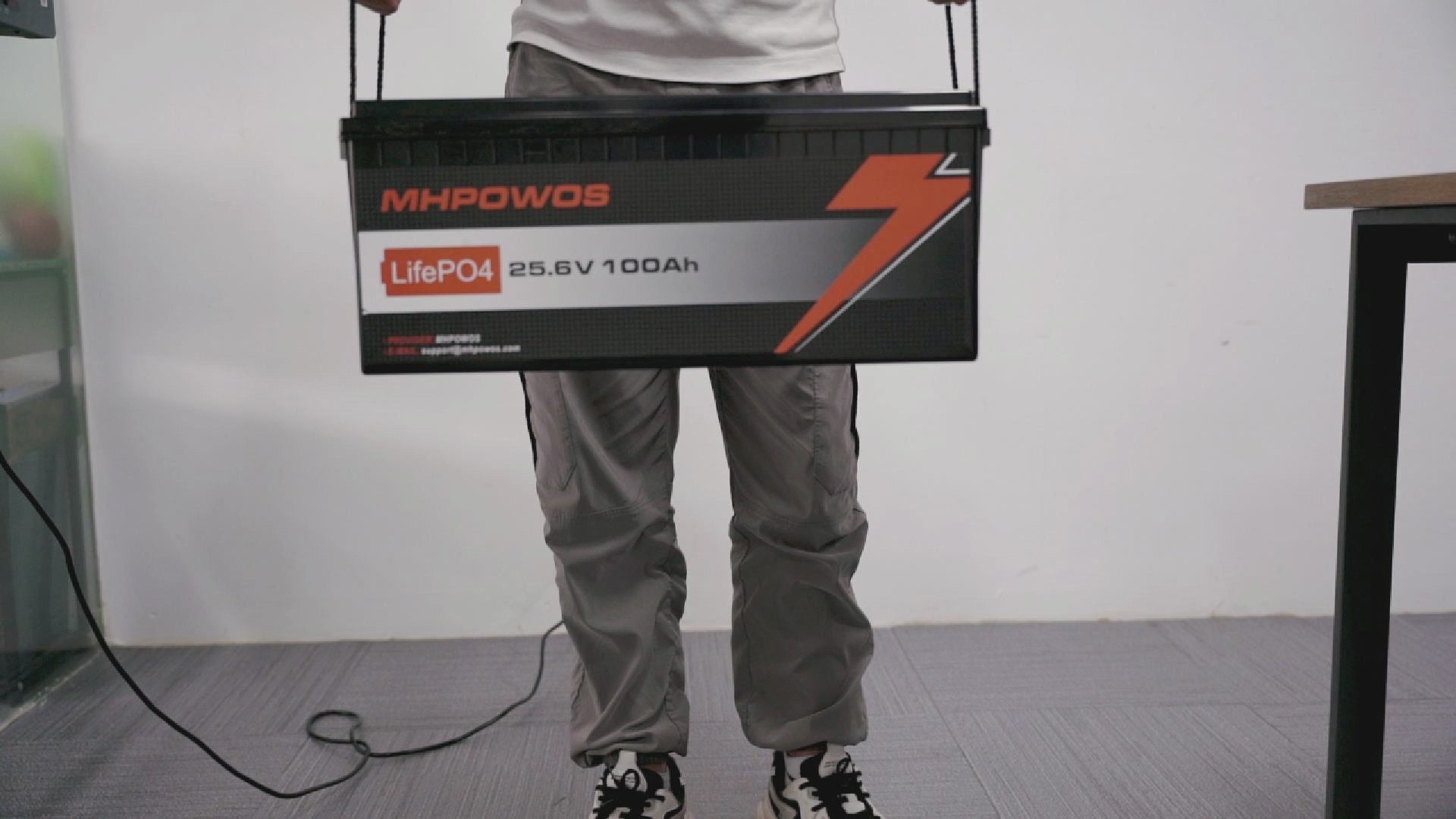• Portable 25.6V 100Ah battery, which is Weight (21kg/46lbs) & Dimensions: 20.9 * 8.2 * 8.4 In