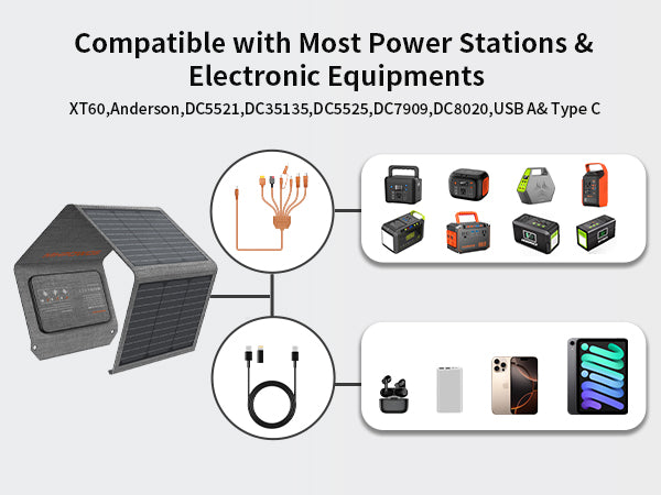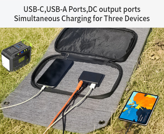 The 40W solar panel has 3 distinct output ports: 1 DC output(5A Max)(7 in 1 solar connector), 1 USB-C output, and 1 USB A. It can charge your phone, iPad, laptop, camera, GPS, power bank, and other devices wherever you are. Please note the maximum voltage and current per port