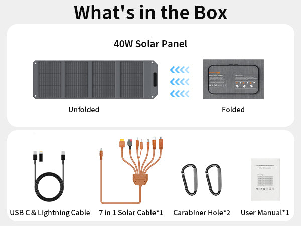 1 x 40W solar panel, 1 x 7-in-1 solar connector, 1 x 2-in-1 USB cable, carabiner x 2, a user manual