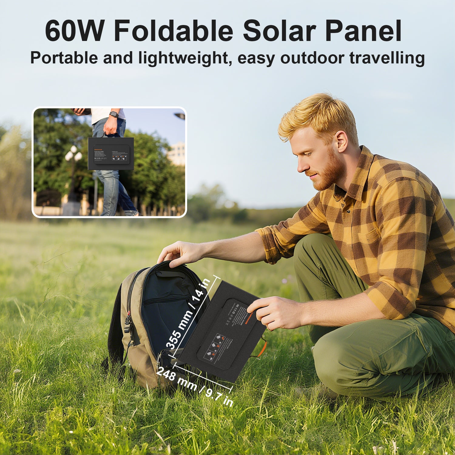 The 60W solar panel folds into a handheld briefcase for easy mounting, transport, hanging, and removal. Lightweight with a kickstand, it unfolds to position on flat surfaces for instant solar charging.
