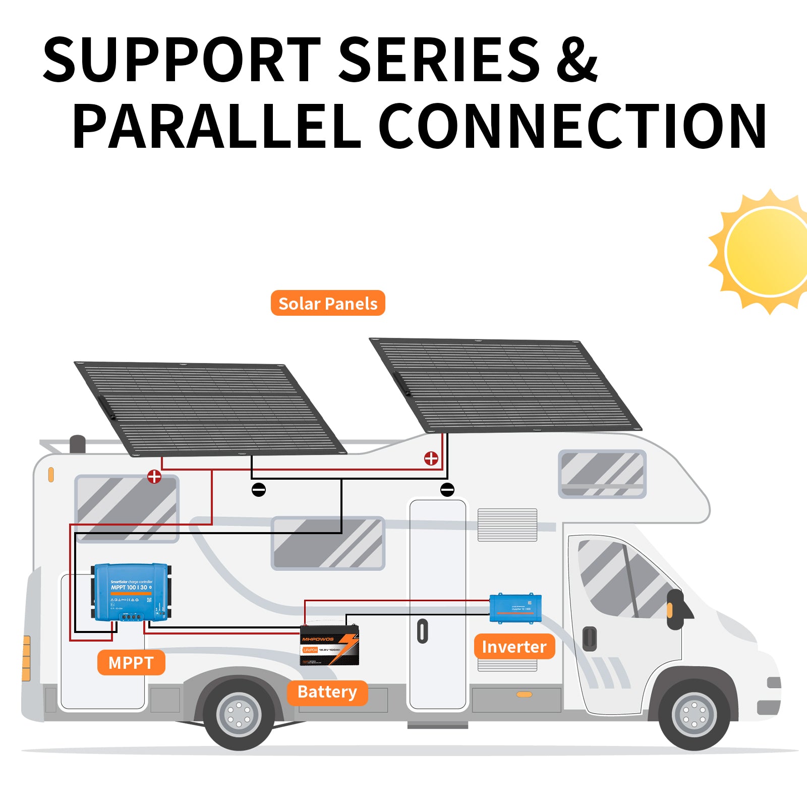 A:Yes. Connecting panels in parallel increases power through doubling the current. Themaximum number of 200W panels allowed in a parallel connection depends on thecontroller and energy storage equipment of your recreational vehicle. Please ensure thatthe energy storage system used in your vehicle supports a higher input current, and youshould use wires with a diameter suitable to the output current to securely connect thepanels in parallel.