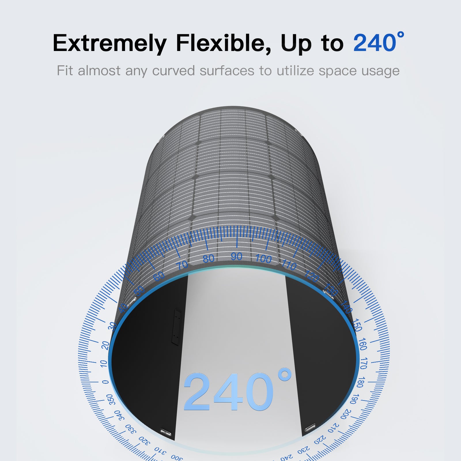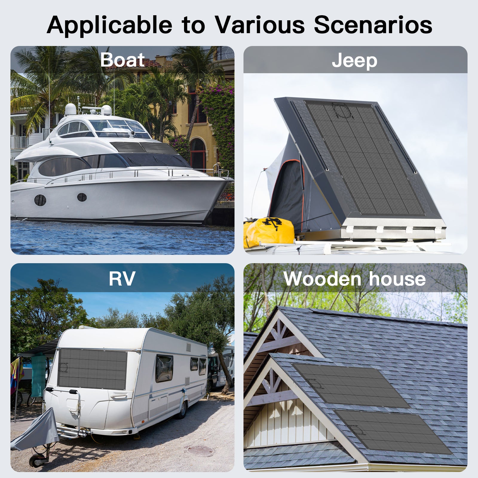 The solar panel apply to most curved surfaces as it is bendable within 240°,such as the front of the RV and the roof. Solar panel is perfect for off-grid solar system, especially for RV and boats.