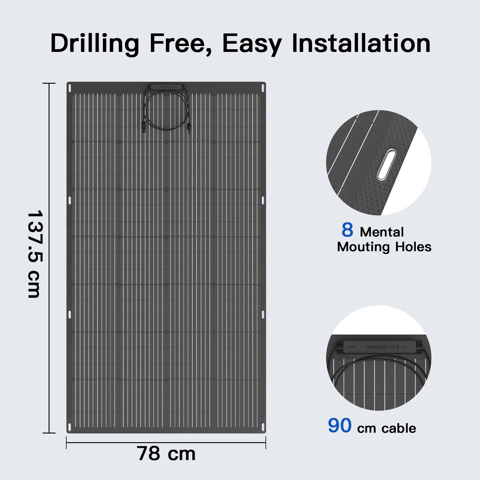 The panels come with 8 mounting holes and 90cm of (cable from central junction box to connector side) solar connector cable for quick and easy installation. The cable runs to the back via the solar connector for connection and extension.