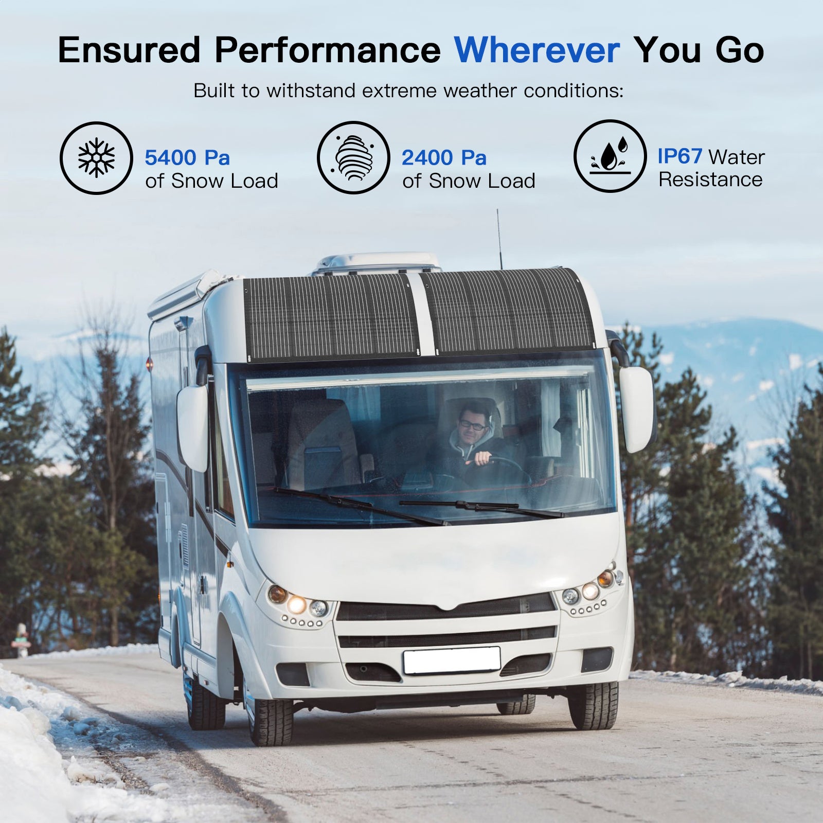 Flexible solar panel comes with IP67 rated waterproof junction box and solar connector-MC4. Solar panel is built to withstand up to 5400 Pa of heavy snow and up to 2400 Pa of high wind extreme weather conditions.Solar panels provide excellent durability in harsh environments.